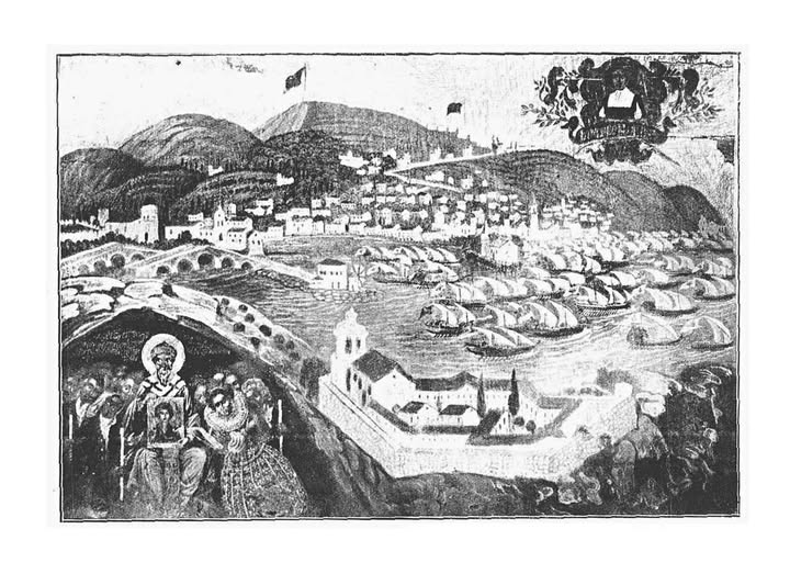 Ο άγνωστος ζωγράφος υποτίθεται ότι βλέπει την πόλιν και τον λιμένα της ιστάμενος επί ενός των υψηλοτέρων ανατολικών λόφων της νήσου και έχων προ αυτού την περίφημον παλαιάν Μονήν της Σκοπιωτίσσης, ήτις και εικονίζεται έμπροσθεν της εικόνος. Ολόκληρος ο λιμήν ανοίγεται ενώπιόν του με τον πληρούντα αυτόν Βενετικόν στόλον (κυματίζει εις όλα τα πλοία η σημαία του Αγίου Μάρκου), όστις εικονίζεται την στιγμήν του απόπλου του εκ του λιμένος.