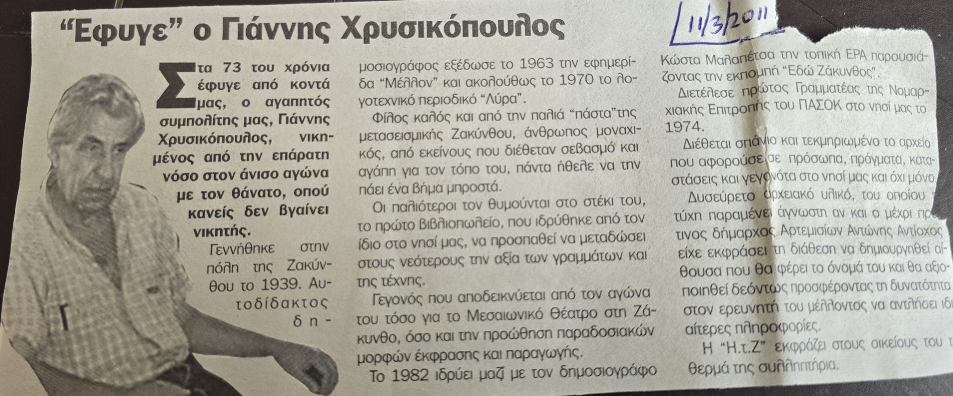 Θυμάμαι τον Αείμνηστο Γιάννη Χρυσικόπουλο… Λες και αν δεν τον ήξερες, δεν σού γέμιζε με τίποτα το μάτι… Όσο μπόϊ τού έλειπε, τόσο “μυαλό ξουράφι” είχε… Χθες την νύχτα, και έδεκει μπλεγμένος μέσα στις σημειώσεις μου, στους φακέλους μου και στα βιβλία μου, βρίσκω το δημοσίευμα της “Ημέρας¨ την 11η Μαρτίου του 2011. Έγραφε λοιπόν η ημερήσια τοπική εφημερίδα “Ημέρα”: “ΕΦΥΓΕ Ο ΓΙΑΝΝΗΣ ΧΡΥΣΙΚΟΠΟΥΛΟΣ… Στα 73 του χρόνια έφυγε από κοντά μας, ο αγαπητός συμπολίτης μας, Γιάννης Χρυσικόπουλος, νικημένος από την επάρατη νόσο στον άνισο αγώνα με τον θάνατο, όπου κανείς δεν βγαίνει νικητής. Γεννήθηκε στην πόλη της Ζακύνθου το 1939. Αυτοδίδακτος δημοσιογράφος, εξέδωσε το 1963 την εφημερίδα “ΜΕΛΛΟΝ” και ακολούθως, το 1970 το λογοτεχνικό περιοδικό “ΛΥΡΑ”. Φίλος καλός, και από την παλιά “πάστα” της μετασεισμικής Ζακύνθου, άνθρωπος μοναχικός, από εκείνους που διέθεταν σεβασμό και αγάπη για τον τόπο του, πάντα ήθελε να τον πάει ένα βήμα μπροστά. οι παλιότεροι τον θυμούνται στο στέκι του, το πρώτο βιβλιοπωλείο, που ιδρύθηκε από τον ίδιο στο νησί μας, να προσπαθεί να μεταδώσει στους νεότερους την αξία των γραμμάτων και της τέχνης. Γεγονός που αποδεικνύεται από τον αγώνα του, τόσο για το Μεσαιωνικό θέατρο στην Ζάκυνθο, όσο και την προώθηση παραδοσιακών μορφών έκφρασης και παραγωγής. Το 1982 ιδρύει μαζί με τον δημοσιογράφο Κώστα Μαλαπέτσα την τοπική ΕΡΑ παρουσιάζοντας την εκπομπή “Εδώ Ζάκυνθος”. Διετέλεσε πρώτος Γραμματέας της Νομαρχιακής Επιτροπής του ΠΑΣΟΚ στο νησί μας το 1974. Διέθετε σπάνιο και τεκμηριωμένο το αρχείο που αφορούσε πρόσωπα, πράγματα, καταστάσεις και γεγονότα στο νησί μας και όχι μόνο. Δυσεύρετο αρχειακό υλικό, του οποίου η τύχη παραμένει άγνωστη, αν και ο μέχρι πρότινος Δήμαρχος Αρτεμησίων Αντώνης Αντίοχος είχε εκφράσει την διάθεση να δημιουργηθεί αίθουσα που θα φέρει το όνομά του και θα αξιοποιηθεί δεόντως προσφέροντας την δυνατότητα στον ερευνητή του μέλλοντος να αντλήσει ιδιαίτερες πληροφορίες’. Ο Γιάννης ο Χρυσικόπουλος είχε γράψει ένα άρθρο τον Ιούνιο του 1976 το οποίο το βρήκα σε άρθρο της εφημερίδας “ΗΜΕΡΑ” την 5/5/2011 και σάς το παραθέτω ως έχει: ” Εισαγωγή  [στη Φωσκολιανή Ανθολογία]