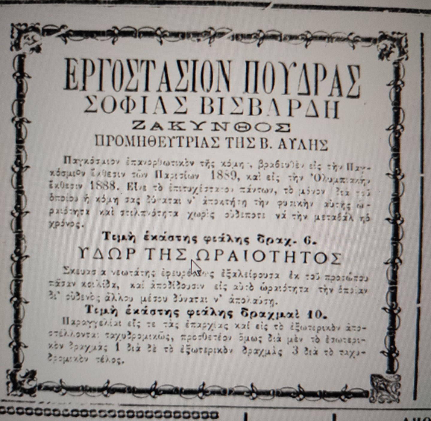 Ύστερον από 120 και επέκεινα έτη πρώτην φοράν δημοσιεύεται η εικών της περιωνύμου εφευρετρίας της πούδρας Ζακύνθου Σοφίας Βισβάρδη. Αύτη εγεννήθη κατά το 1799 και απέθανε τω 1890 με ένδυμα Κομίσσης της εποχής εκείνης. Εκ της επιφανούς των ευγενών οικογενείας Tomazi Bisbardi του επωνομαζομένου μετά του τίτλου του Al Nobile Signore Gm Dimitrio Tomazo Bisbardi και όστις είχεν αδελφόν τον πανοσιώτατον κύριον Ιωάννην Βισβάρδην εφημέριον της εν Βενετία Ορθοδόξου Εκκλησίας του Αγίου Γεωργίου, έχομεν τον έγγονον αυτού Δημήτριον Βισβάρδη. Αποθανών ο πατήρ του εγκατέλειψε κολοσσιαίαν περιουσίαν την οποίαν ο Δημ. Βισβάρδης εσπατάλησε και άφησε την σύζυγόν του Σοφίαν πτωχότατην. Κατά την πτωχείαν της ο παλαιός φίλος της οικογενείας της εις Ιταλός αγιογράφος βλέπων την Σοφίαν υποφέρουσαν της έδειξε τον τρόπον να κατασκευάζη την πούδραν και της οποίας την τελειότητα ανέπτυξε ο υιός της Θωμάς Βισβάρδης σπουδάσας επί 17 έτη εν Γερμανία ως χημικός.