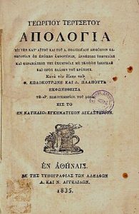 Πρώτη έκδοση της Απολογίας του Τερτσέτη στο Δικαστήριο του Ναυπλίου, όπου δικαζόταν ως κατηγορούμενοι με τον Πολυζωϊδη, για τη στάση τους ως Δικαστών στη Δίκη του Κολοκοτρώνη και του Πλαπούτα, γραμμένη από τον Γεώργιο Τερτσέτη. Αθήνα 1835.