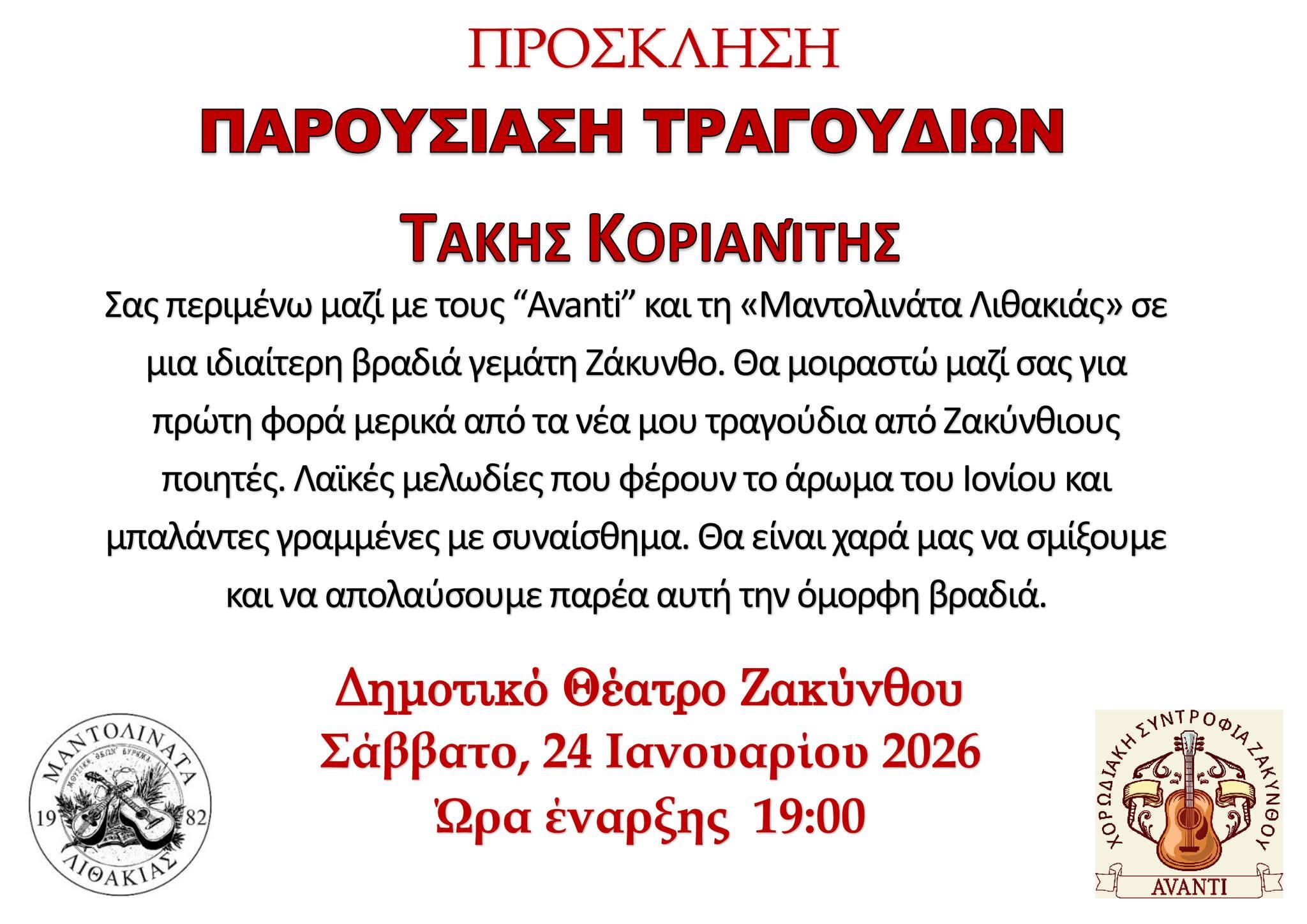 Μία μουσική πανδαισία νέων τραγουδιών κατά το ιδιαίτερο Επτανησιακό στυλ παρουσιάζονται το ερχόμενο Σάββατο 24 Ιανουαρίου και ώρα 19.00 στο Δημοτικό Θέατρο Ζακύνθου από την Μαντολινάτα Λιθακιάς Ζακύνθου και την Χορωδιακή Συντροφιά Ζακύνθου “AVANTI”. Την παρουσίαση των νέων τραγουδιών επιμελείται και έχει γράψει την μουσική ο Μαέστρος των δύο πιο πάνω μουσικών συνόλων κ. Τάκης Κοριανίτης και έχει θέμα “Λαϊκές Ζακυνθινές μελωδίες και μπαλάντες με στίχους Ζακυνθινών ποιητών”. Την συνδιοργάνωση της εκδήλωσης την έχει ο Δήμος Ζακύνθου και καλούνται οι φιλόμουσοι και οι φίλοι που τούς αρέσει η Επτανησιακή μουσική, να παρακολουθήσουν την προσπάθεια αυτή παραγωγής νέων τραγουδιών όπου σκοπό έχει να προωθηθεί η παράδοσή μας παντού αλλά και να βγαίνουν και να γράφονται και να τραγουδάμε νέα τραγούδια που γράφουν αξιόλογοι συμπολίτες μας.