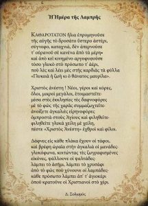 Από το βιβλίο του Αειμνήστου Λαογράφου ΔΙΟΝΥΣΗ ΦΛΕΜΟΤΟΜΟΥ “Τοπίο Εορτασμών” διαβάζουμε για τα ιδιαίτερα έθιμά μας ετούτο το Μεγάλο Σαββάτο: Τις πρώτες πρωινές ώρες του Μεγάλου Σαββάτου, γύρω στις 3, ξεκινά στον Μητροπολιτικό Ναό η ακολουθία του Επιταφίου Θρήνου, ο οποίος στην ουσία είναι ο Όρθρος του Μεγάλου Σαββάτου και απλά, για λόγους οικονομίας, έχει μεταφερθεί στο βράδυ της Μεγάλης Παρασκευής. Εδώ δηλαδή τηρείται η παλιά και γνωστή τάξη. Στο τέλος της ακολουθίας πραγματοποιείται στο κέντρο της πόλης η μοναδική σε αυτή Λιτανεία του Επιταφίου. Τον συνοδεύει ξανά η Mater Dolorosa (H Παναγία του Πάθους), και όλο το πένθιμο κλίμα του μεσημεριού της προηγούμενης ημέρας αναβιώνει και εδώ. Μαύρα πεύκια στα μπαλκόνια, μεσίστιες σημαίες, μαύρος ουρανός και καπίτουλα. Επίσης, ο Επίσκοπος και όλοι οι Ιερωμένοι φορούν, σύμφωνα με την τοπική παράδοση, μαύρα άμφια. Με την επιστροφή του στον Ναό το κουβούκλιο τοποθετείται στο κεφαλόσκαλο του Ιερού. Την ώρα του Ευαγγελίου και με την φράση «Οι δε πορευθέντες ησφαλίσαντο τον τάφον, σφραγίσαντες τον λίθον μετά της κουστωδίας», ο Επιτάφιος μπαίνει μέσα στο Ιερό ολόκληρος και κλείνει η πόρτα της Ωραίας Πύλης. Ο Αμνός τοποθετείται πάνω στην Αγία Τράπεζα… Αμέσως μετά ακολουθεί ο Εσπερινός με την Λειτουργία του Μεγάλου Βασιλείου. Χαρακτηριστικός στην Θεία Λειτουργία είναι ο περίφημος ύμνος των Τριών Παίδων, το κοσμαγάπητο «Τον Κύριον Υμνείτε…», ο οποίος τονισμένος μοναδικά στο τοπικό, μουσικό, εκκλησιαστικό ιδίωμα ψάλλεται από κλήρο και από τον λαό μαζί. Στην Ιερά Μονή Στροφάδων και Αγίου Διονυσίου Ζακύνθου μάλιστα, αξίζει να σημειωθεί ότι το πρωινό του Μεγάλου Σαββάτου, δημιουργείται από το πουθενά, ένας άτυπος «τρίτος χορός», εντός του Ιερού, γύρω από την Αγία Τράπεζα. Εκεί, αποδίδεται ο Ύμνος των Τριών Παίδων και από τους δύο χορούς της Μονής αλλά και από τον τρίτο, εκείνης και μόνο ημέρας και μόνο για να αποδοθεί κατά το Ζακύνθιο ύφος το «Τον Κύριον Υμνείτε».